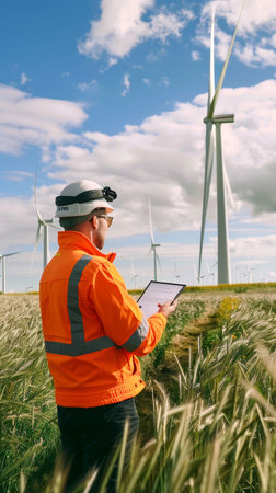 Engineer inspects wind turbines in a vibrant green field under a blue sky, showcasing renewable energy developments.