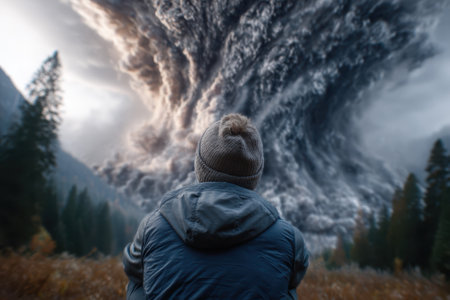 A person wearing a beanie gazes at a massive volcanic eruption in a remote mountain area during sunset.