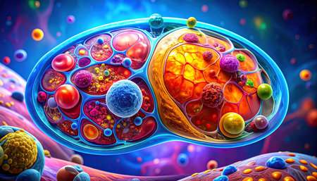 Abstract visualization of two interconnected cells filled with colorful spheres and intricate internal...