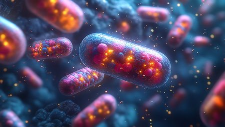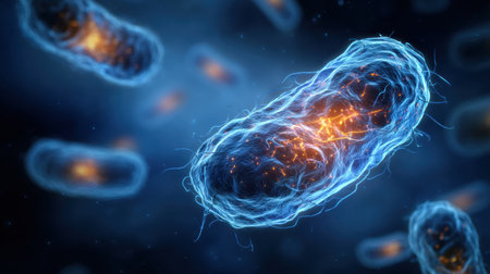 Illustration shows glowing bacteria against a blue backdrop, vividly showing cellular features.