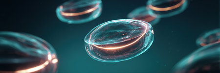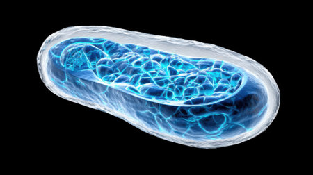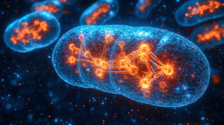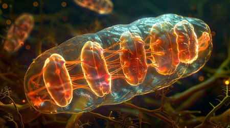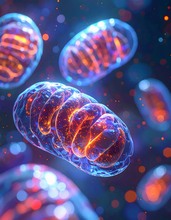 Multiple mitochondria float in a luminous environment, their orange folds glowing within translucent membranes, symbolizing cellular energy production in biology