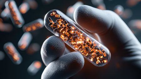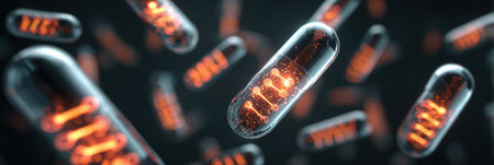 A collection of transparent capsules illuminated from within by glowing orange elements suspended in a dark backdrop, highlighting advanced design.
