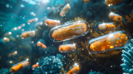 Captivating abstract image of a glowing capsule that represents a DNA structure, set against a vibrant bioluminescent background illustrating dynamic scientific concepts.