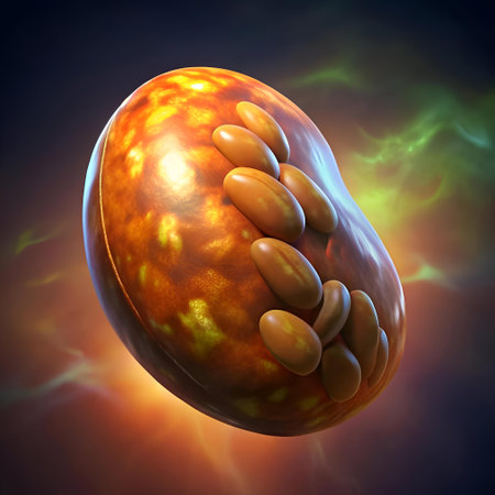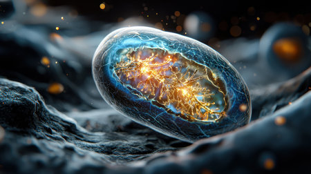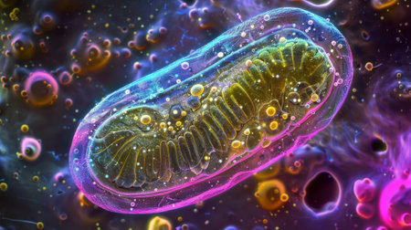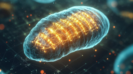 Captivating visualization of a mitochondrion showcasing intricate details and glowing energy patterns, set against an abstract scientific environment, perfect for educational or research use.