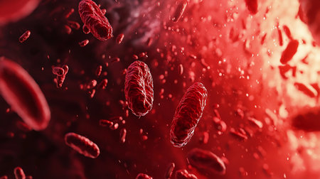 Detailed 3D rendering of red blood cells flowing through a vein. The image highlights the cells' unique shape and the blood's texture, emphasizing medical and scientific concepts.