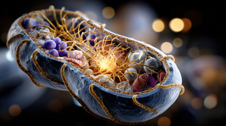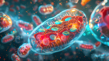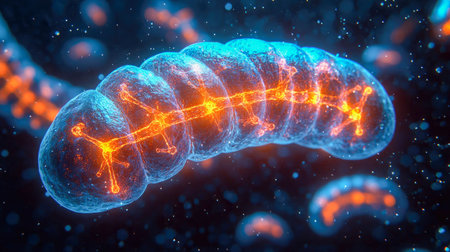 This stunning digital illustration showcases illuminated mitochondria, the essential powerhouses of cells, highlighting their vital role in cellular energy processes within living organisms.