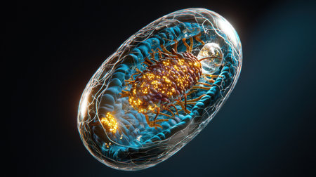 Close-up of a single biological cell with glowing edges and complex internal structures on a dark background. Copy space.
