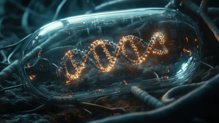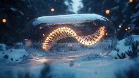 This captivating image showcases a 3D rendering of a DNA structure within a transparent capsule, symbolizing innovations in genetic research and biotechnology, perfect for scientific context.