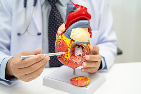 Cardiovascular disease CVD, Asian doctor holding human anatomy model for learn and treat heart disease.