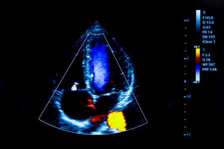 Modern echocardiography (ultrasound) machine monitor. Colour image. New hospitl equipment for a better diagnostics. Four Chambers View, PW Mode.