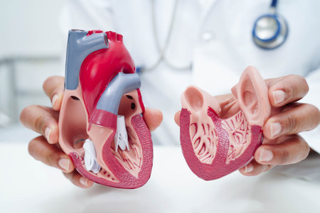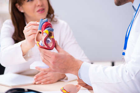 Two doctors observe a realistic 3D heart model, discussing its features within a medical setting.