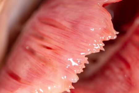 raw meat, veal heart, blood vessels and arteries close-up, heart anatomy.