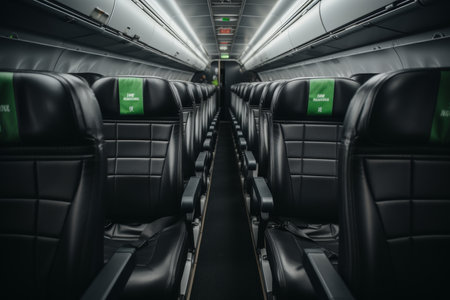 Empty airplane cabin with black leather seats in a 3-3 configuration. Well-lit, modern feel, single aisle. Aviation, travel, passenger, airline, interior, flight, seat, comfort.