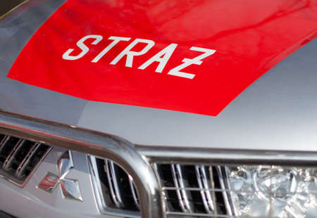 Poznan, Poland - March 26, 2021: Polish fire brigade - inscription on the car