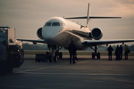 Aircraft learjet Plane in front of the Airport with cloudy sky and sun