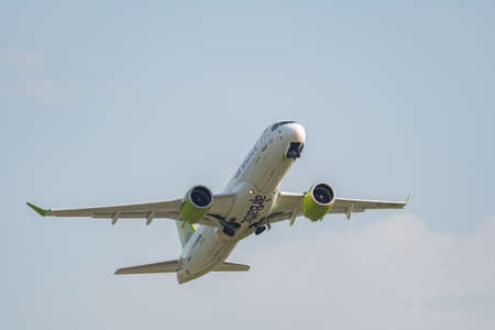 Zurich, Switzerland, May 20, 2022 Air Baltic Bombardier CS-300 or A220-300 aircraft is taking off from runway 32