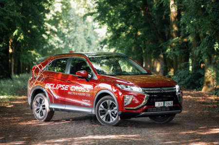 Kosava, Belarus - June 7, 2017: New 2018 Mitsubishi Eclipse Cross in green forest