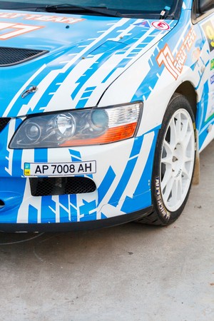 Lviv, Ukraine - Otober 2015: A racing car for the rally in a closed garage before the start of the race