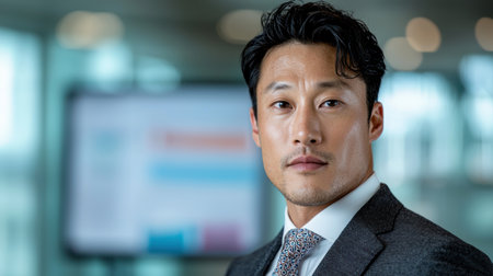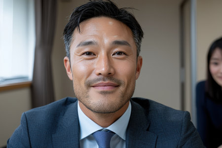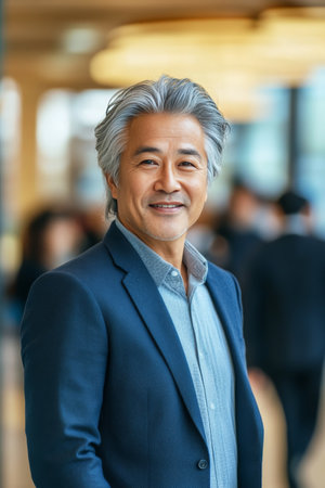 A happy middle-aged Japanese business man is looking away at copy space. The smiling, confident 50-year-old mature professional businessman, executive, CEO, manager, or entrepreneur stands against a gray office wall background.