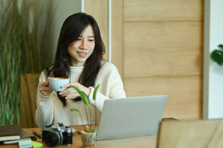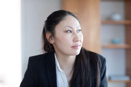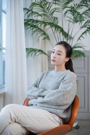 Thoughtful asian woman in white sweater using laptop computer at home.