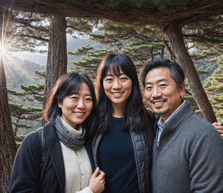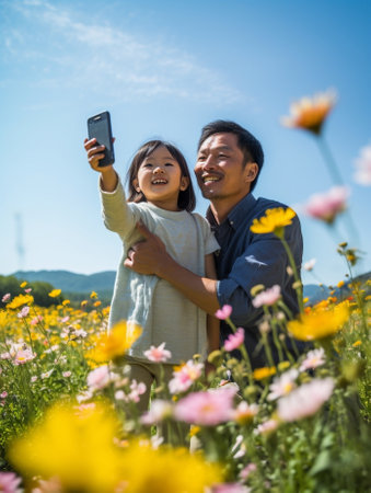 Generative AI : other and baby daughter photographing selfie themselves by mobile phone in summer