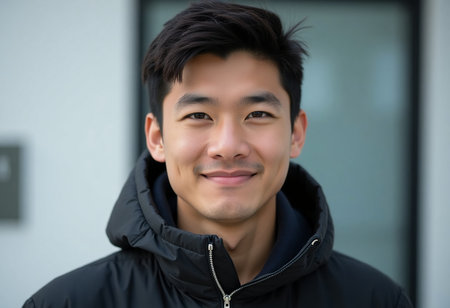 Young adult handsome Asian man portrait, male model with dark hair studio shot, background with copy space, diversity and different beauty concept, AI generated