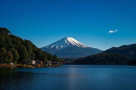 A tranquil lake under Mount Fuji, a poetic picture of the reflection of a snow-capped mountain