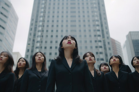 Group of Japanese businesswomen, standing facing each other. in the background the financial district. High quality photo
