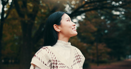 Japanese woman, thinking and outdoor with ideas, confidence or pride in garden or park. Female person, smile and biology student in planning for vacation, happiness or travel in nature or countryside