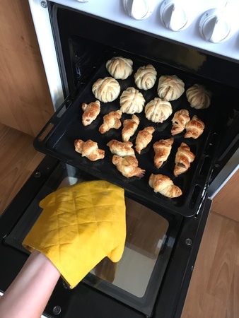 Woman hand with a protective glove takes out of the oven baked rolls. The process of preparing homemade rolls pastry. Domestic and hand made food preparation concept. Close up, selective focus