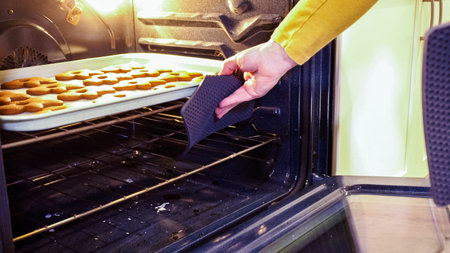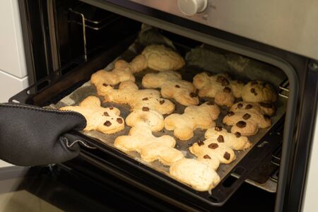 a hand in a kitchen glove takes out tasty oven cookies in the shape of men from the oven