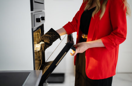 Cropped view of woman hand open door built in oven equipment, standing near kitchen appliance in modern interior house, baking food