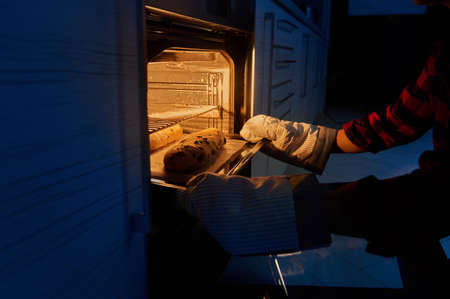 Close-up of woman's hands in kitchen gloves taking out a traditional Christmas German stollen on a baking tray from a hot oven. Christmas culinary concept. Food and drink