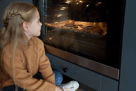 Young woman in the kitchen is cooking food in the oven. The light from the oven, checks the readiness of pastries. Horizontal photos