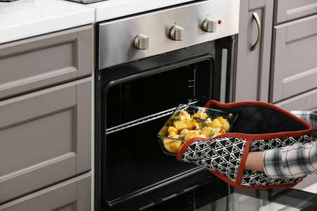 Woman taking out of oven dish with tasty baked potatoes and garlic in kitchen