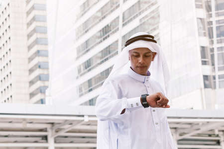 Handsome modern Arabian man standing in modern city wear muslim dress headscarf eastern ethnic smile outside office. Arab Man looking plan new project while walking in big city. Business successful