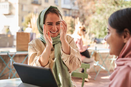 Brunette woman of islam religion telling something to her best friend wearing abaya