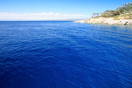 Ocean sea water surface deep blue, calm with ripple, small cloud on blue sky background. Aegean Mediterranean sea, Greece
