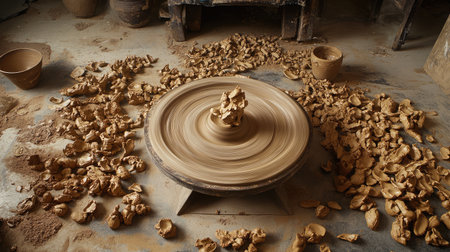 A vibrant pottery workshop scene featuring a spinning wheel, raw clay shavings, and tools, highlighting the skilled craftsmanship involved in creating unique pottery pieces.