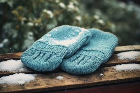 A heartwarming scene of cozy knitted mittens resting on fresh snow, capturing the essence of winter togetherness and seasonal warmth.