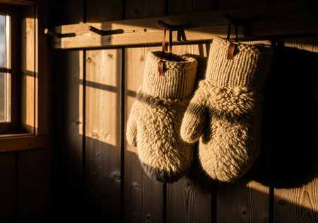 Chunky knitted mittens hanging on a rustic wooden coat rack. warm sunlight streams through a window, casting dramatic shadows on the wood paneling, symbolizing winter, warmth, and cozy comfort.