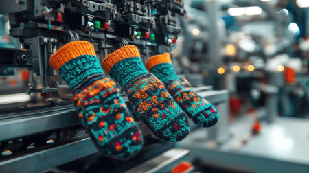 This photo captures colorful knitted mittens on a production line in a textiles factory, showcasing the intersection of craftsmanship and modern manufacturing.