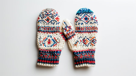 Knitted red mittens resting on soft snow, highlighting unique patterns and textures, perfect for winter fashion, warmth, and seasonal celebrations