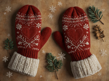 A pair of cozy red mittens adorned with white snowflakes rests on a rustic wooden surface. Pine cones and soft snow enhance the wintery atmosphere, perfect for holiday warmth.