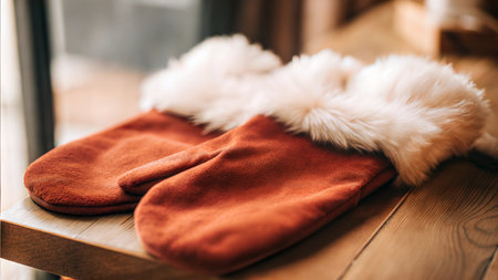 Close-up of a pair of cozy orange mittens with fluffy white trim, resting on a wooden surface.