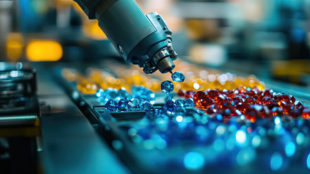 A robotic arm efficiently sorts vibrant gems in a modern manufacturing facility, showcasing advanced technology and automation in industrial processes.