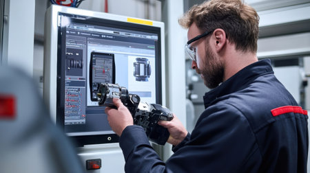 Engineer comparing component with digital model on computer screen