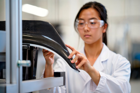 Female engineer inspecting a carbon fiber component in a research laboratory.