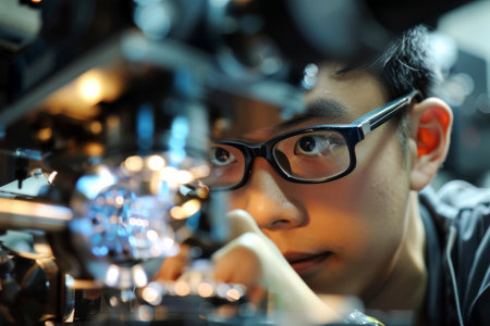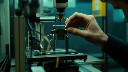 A technician focuses on a delicate operation involving precision equipment in a laboratory. The scene showcases advanced technology and meticulous work.