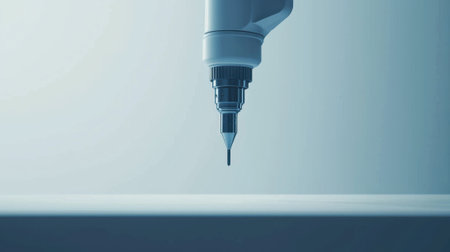 A robot is drilling a hole into a surface. The robot is white and has a blue tip